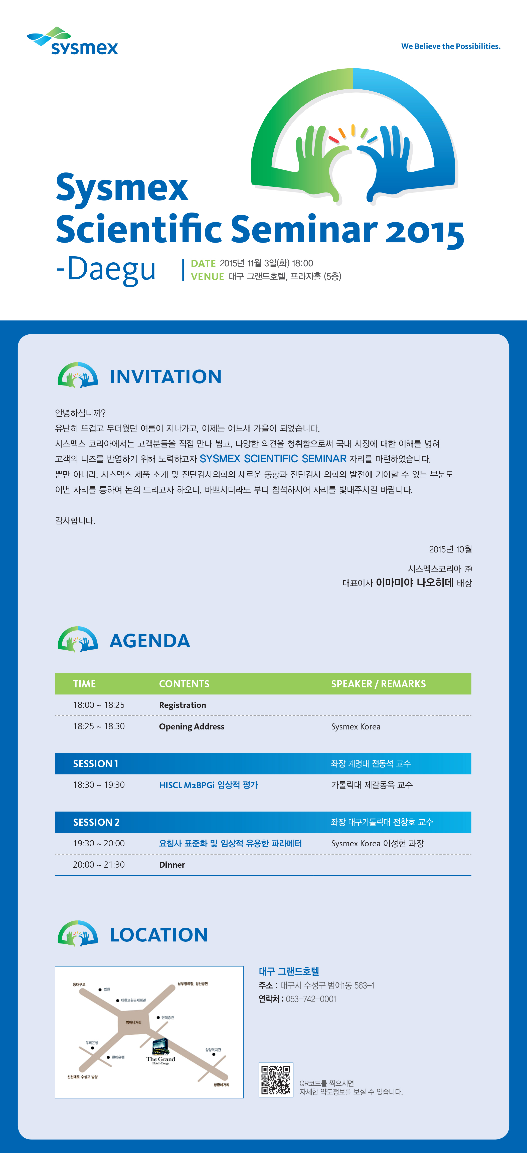 시스멕스 코리아는 고객분들을 직접 만나뵙고, 다양한 의견을 청취함으로 대구경북지역 고고객에 대한 이해를 넓혀, 고객의 니즈를 반영하기 위해 노력하고자 대구에서 시스멕스 학술세미나 자리를 마련하였습니다