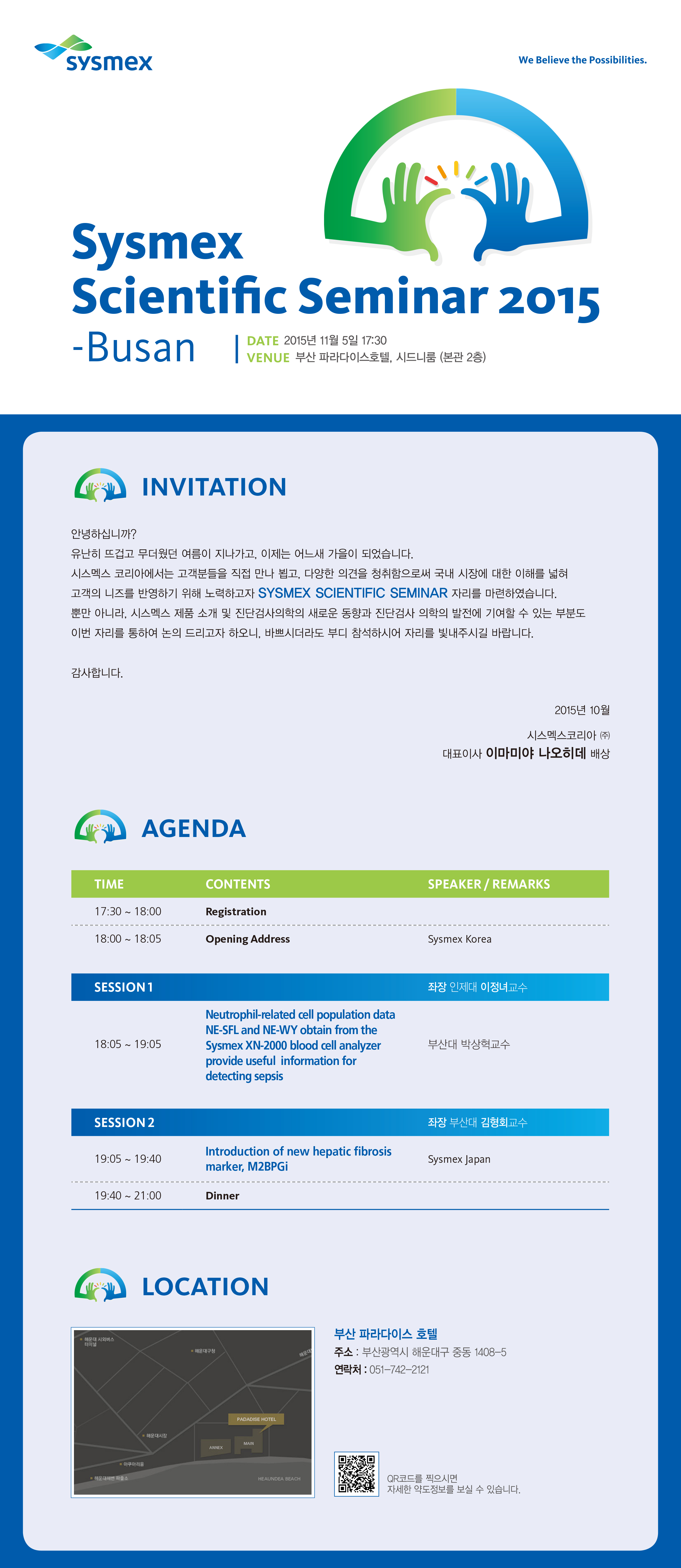 시스멕스 코리아는 고객분들을 직접 만나뵙고, 다양한 의견을 청취함으로 부산, 경남지역 고객에 대한 이해를 넓혀, 고객의 니즈(needs)를 반영하기 위해 노력하고자, 부산에서 시스멕스 학술세미나 자리를 마련하였습니다