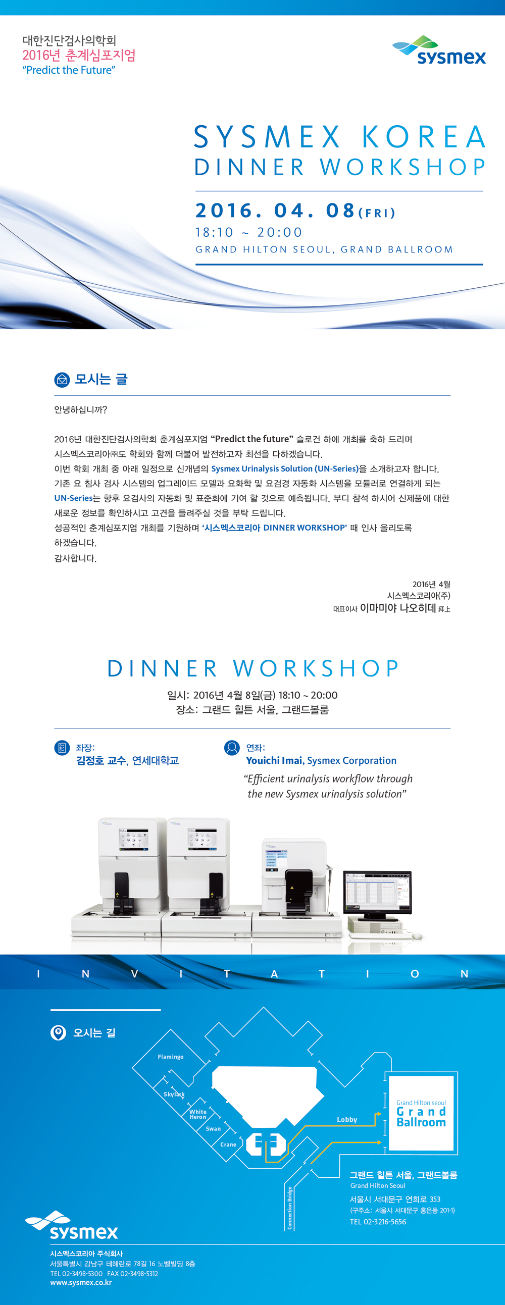 시스멕스코리아는 대한진단검사의학회 2016년 춘계심포지엄에서 Dinner workshop을 준비 하였습니다. 이번 workshop에서는 신개념의 Sysmex Urinalysis Solution (UN-Series)을 소개해드리고자 합니다. 많은 관심과 성원 부탁 드립니다.