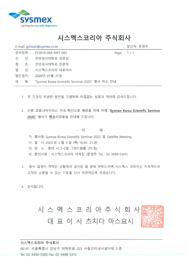 행사 취소) "Sysmex Korea Scientific Seminar 2020" 행사 취소 안내